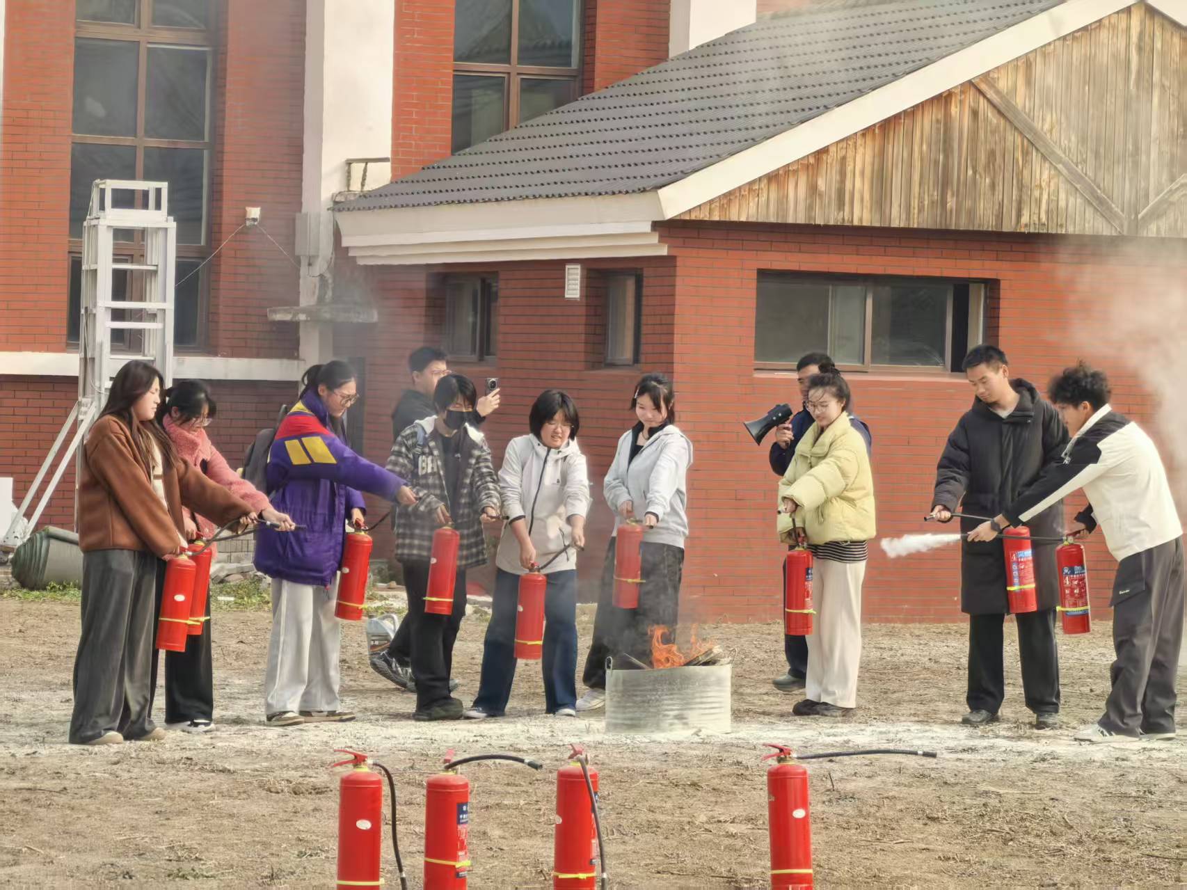培训后,师生参加了校地联合消防演练,通过模拟火情紧急疏散检验学院灭火和应急疏散预案。活动中,师生做好自我防护,有序快速疏散至安全地带,现场观摩属地消防部门灭火处置流程,之后在学校保卫处指导下,系统学习了灭火器使用方法,亲自体验扑灭初起火灾,进一步提高了师生的抗御火灾能力,培养了师生在灾害出现时的自救互助和疏散逃生能力。