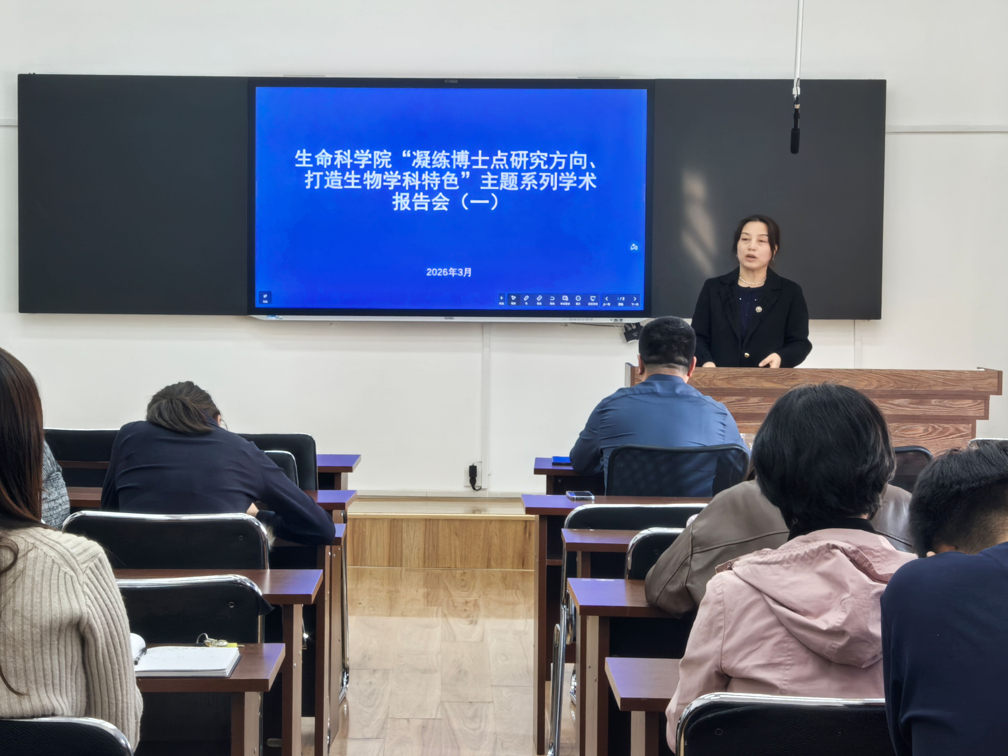 2026年3月27日,生命科学院举办“凝练博士点研究方向,打造生物学科特色”主题系列学术报告会首场活动。本次报告会紧扣生物学学科发展前沿,立足学院博士点申报与学科建设核心工作,开展高水平学术交流与研讨。会议由生命科学院副院长毕秀丽主持,院长胡风庆出席会议,学院各学科点硕士生导师、硕士研究生共同参与本次学术活动。